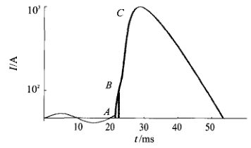 如图1所示,当发生短路故障时,传统空气开关在电流升至C点时才能动作,且无法瞬时切断电流,而固态开关则可以在电流升至B点时即瞬间切断短路电流。