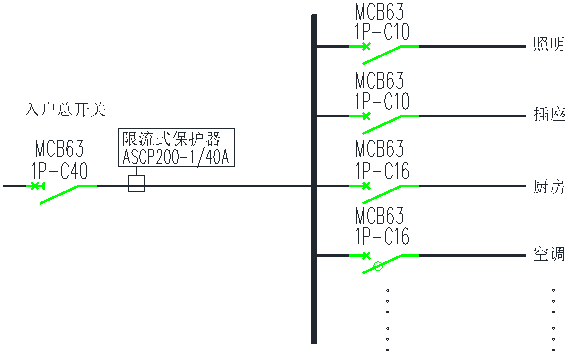 ASCP200-1型电气防火限流式保护器建议安装在入户开关下端,额定电流值根据入户开关的具体规格进行设置,典型应用示意图如图2所示: