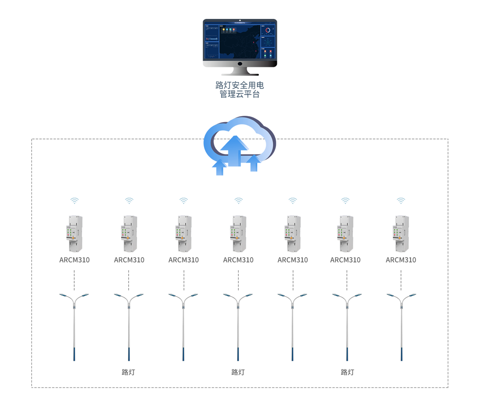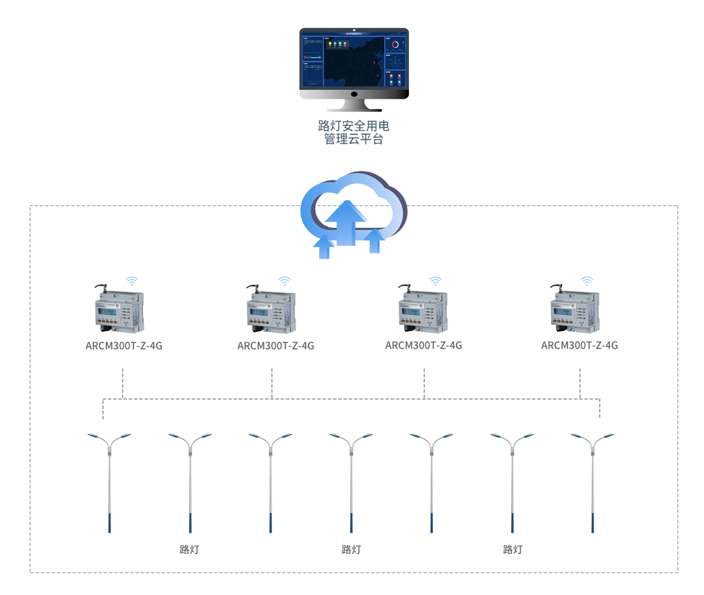 直接接入ARCM310仪表,监控每个路灯的电压、电流等电参量进行预警和报警,也可设置定时通断时间并远程控制路灯通断