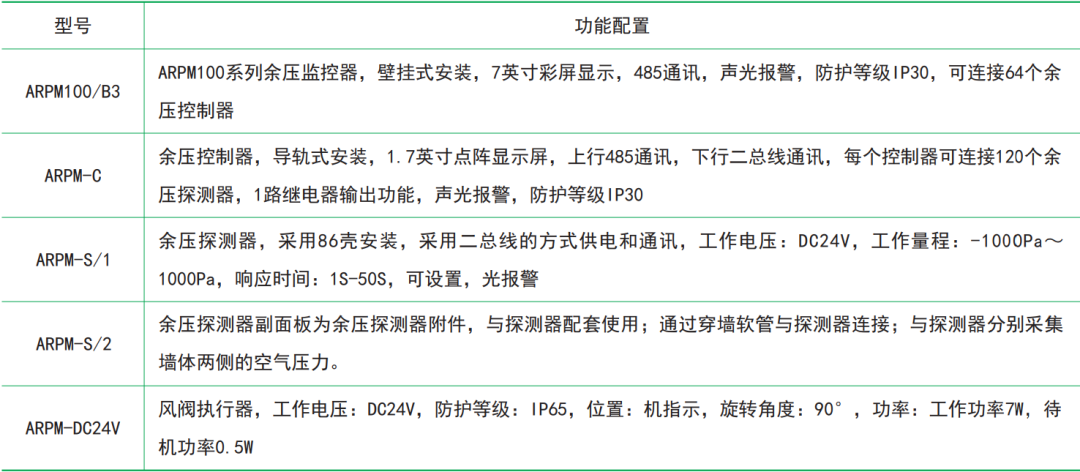 余压监控系统由余压监控器(主机)、余压控制器、余压探测器、风阀执行器、系统监控软件等部分或全部设备组成满足并高于GB51251《建筑防烟排烟系统技术标准》、GB50016《建筑设计防火规范》和GB50098《人民防空工程设计防火规范》等相关家标准中的功能需求。