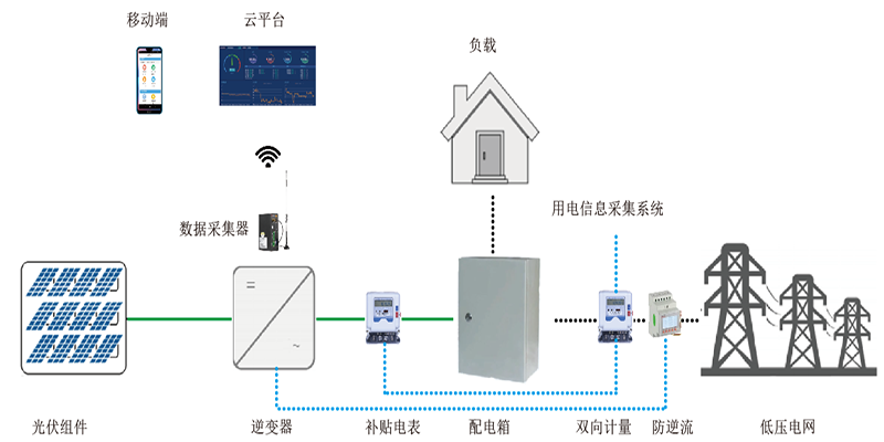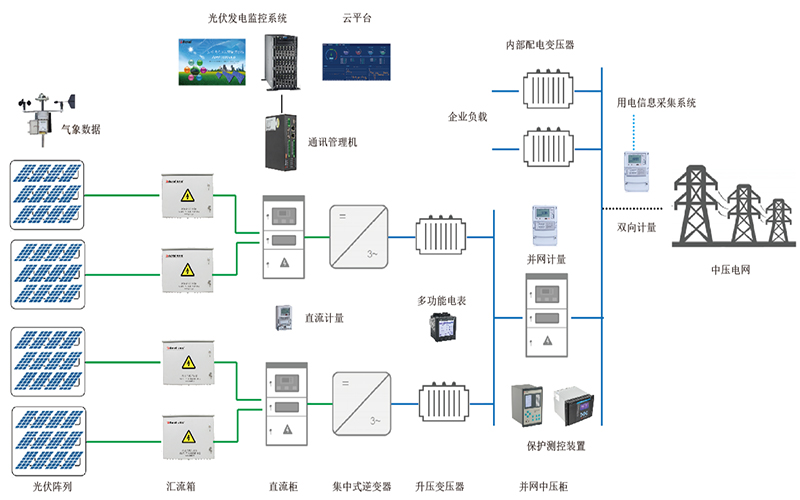 光伏阵列接入组串式光伏逆变器,或者通过汇流箱接入逆变器,然后接入企业380V电网,实现自发自用,余电上网。在380V并网点前需要安装计量电表用于计量光伏发电量,同时在企业电网和公共电网连接处也需要安装双向计量电表,用于计量企业上网电量,数据均应上传供电部门用电信息采集系统,用于光伏发电补贴和上网电量结算。