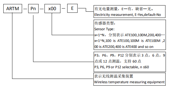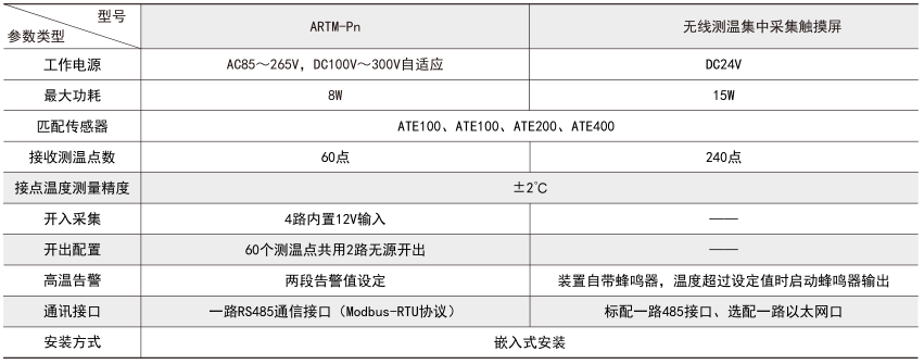 ARTM-Pn无线测温装置:ARTM-Pn无线测温装置可以单独安装在高压柜、低压抽屉柜内,每台装置可以接收18个传感器的数据,传感器型号可选配ATE100、ATE200、ATE300。装置带有路485接口,可将采集到的温度数据上传到监控中心。