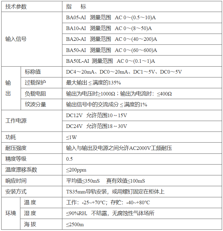 BA 系列产品应用电磁感应原理,对电网中的交流电流进行实时测量,采用恒流和线性补偿技术,将其隔离变换为标准的直流信号输出。24 伏或 12 伏安全电压供电,可广泛用于工业自动化领域。BA50L 为变流剩余电流互感器主要检测用电系统的漏电流,能随时掌握电气线路和设备的情况,防止因漏电而发生的火灾等事故。