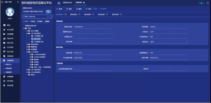 系统可配置每个变电所内变压器、进线柜、出线柜、计量柜、高压电缆等设备信息,记录设备的厂家、型号、投运日期等,并可通过报表统计近期需要保养或换的设备。