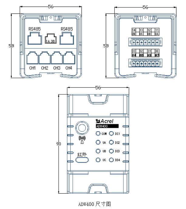 ADW400环保监测模块主要用于计量低压网络的三相有功电能,同时可选择四个回路的电流输入,具有RS485通讯和470MHz无线通讯功能,方便用户进行用电监测、集抄和管理。可灵活安装于配电箱内,实现对不同区域和不同负荷的分项电能计量,统计和分析。